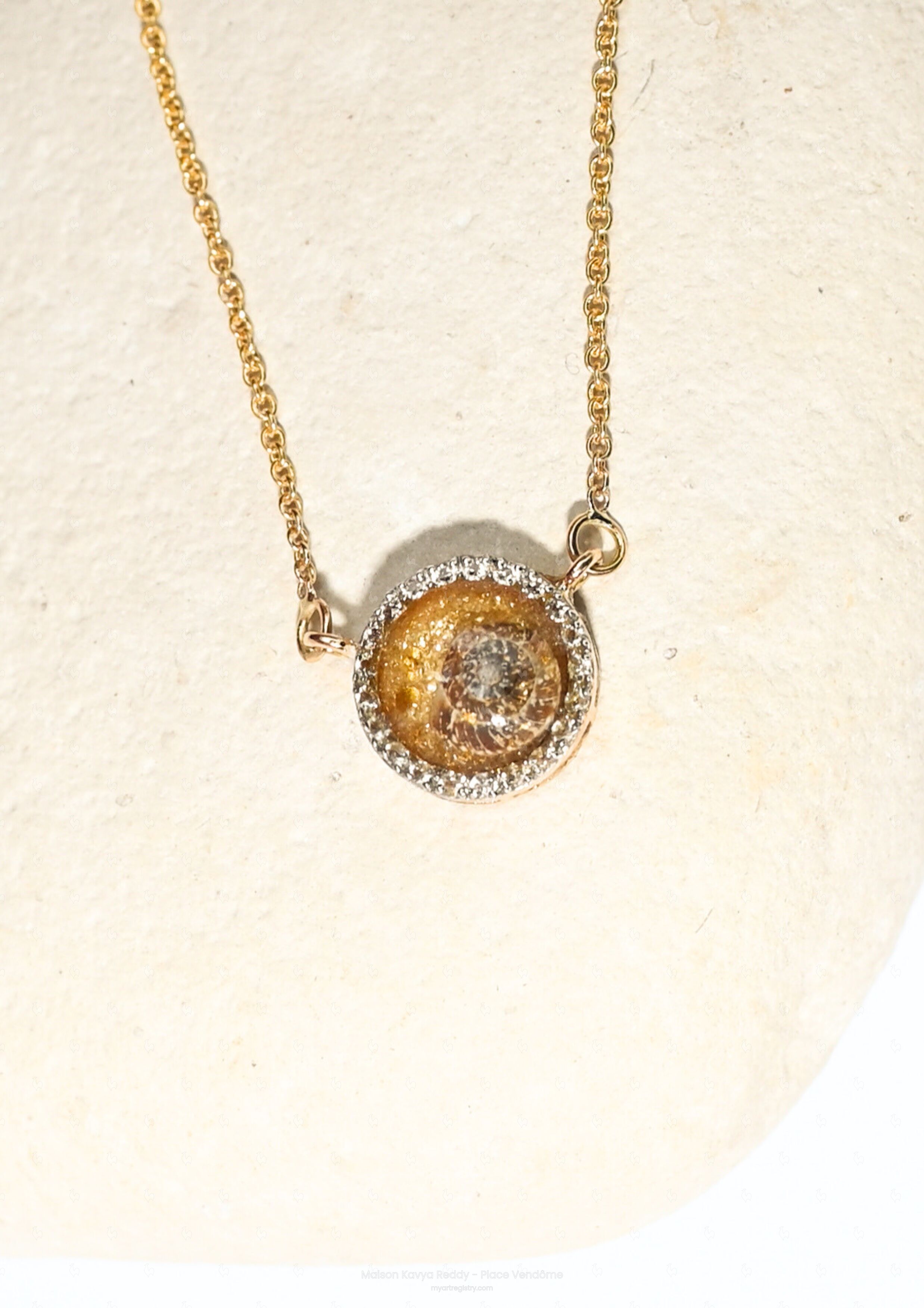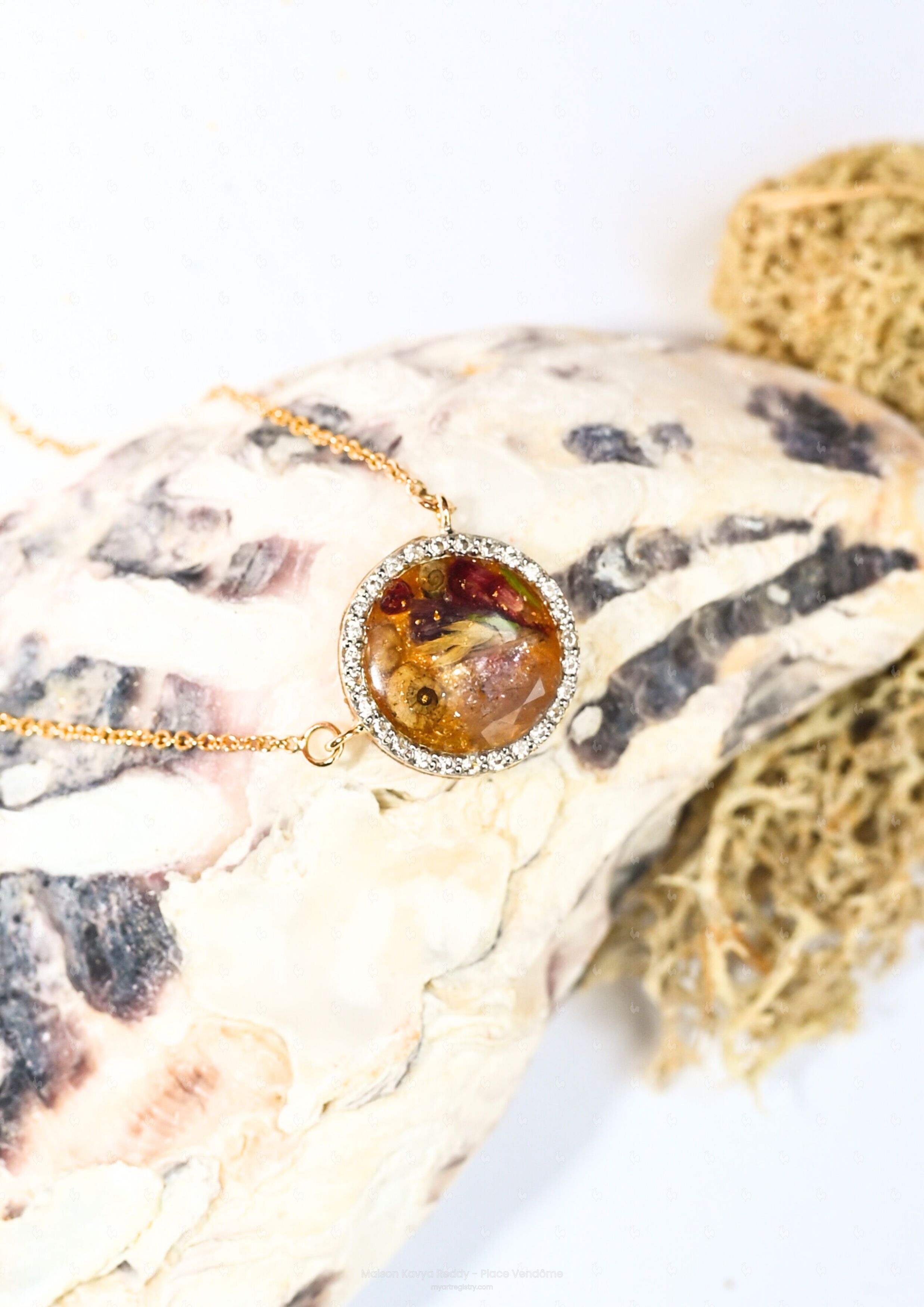 Ce pendentif circulaire, délicatement ceinturé de zircones, s’illumine d’un fond scintillant de poussière d’or 24 carats. En son cœur repose un coquillage spiralé, lové entre de fines fleurs bordeaux et un unique bleuet — fleur de la mémoire et de la fidélité.